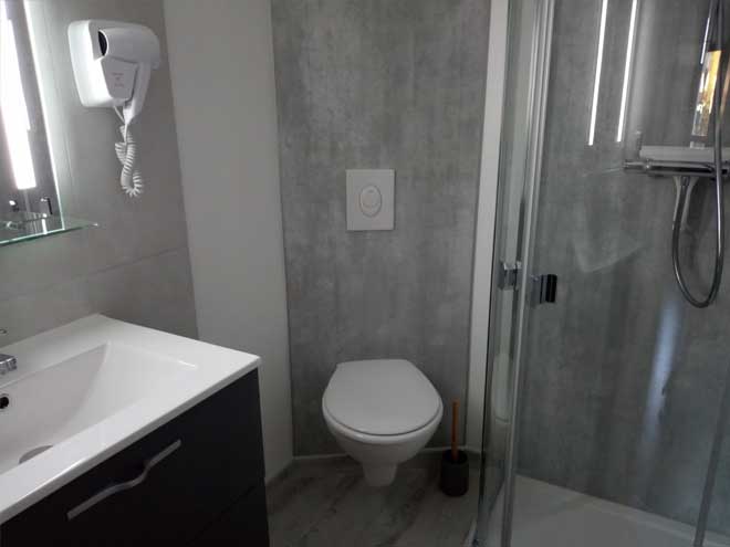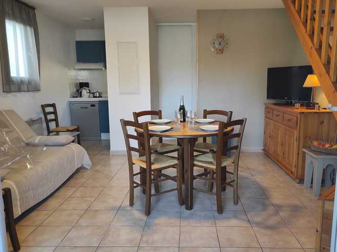 Pièce à vivre :clic clac,cuisine aménagée,lave vaisselle,coin repas,,écran plat,un wc